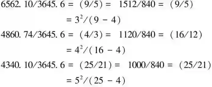 为这些谱线确定了另一个公共质数因子,其值为23×3×5×7=840,再将4个波数改回4条氢谱线波长分别为:6562.1Å, 4860.74Å, 4340.1Å, 4101.2Å,于是从红光波长可求得公共因子数值为6562.1/(1512/840)=3645.6,就这样找到了巴耳末基数,至于巴耳末公式,可从4条氢谱线波长比转成质数因子比,特征是分别除以公共因子,公式就得以推导,其过程如下: