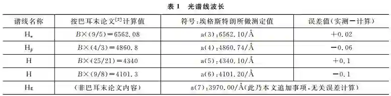 由于不知道当时巴耳末分析数据的误差是什么情况,其采用分数比例形式计算出来的波长真的可信吗?这里得先做公式计算与实际测量的误差计算,倘若误差不能接受,那么巴耳末公式就不值得深究下去了。考虑原巴耳末取材自当时氢原子光谱在可见光区波段早被埃格斯特朗测定的4条谱线波长数据,再经巴耳末公式计算并进行与实际测量的误差计算,详如表1所示,可以发现误差小于波长的吻合得十分出色,因此有信心深入探索。又为了增加数据分析的难度,另再追加一条谱线波长数据,总共拿这红、青绿、青、蓝、紫等5色氢原子光谱谱线波长,并以符号化为各项光谱线波长命名如表1所示。