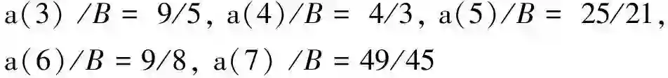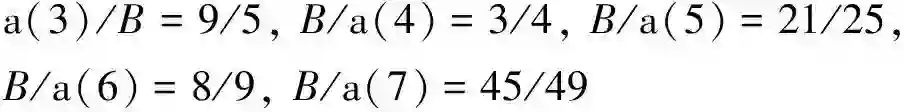 在不知参数B 切确数值条件之下,从这些符号整数比恒等式的渐增平方规律,很容易从前5个式子归纳出巴耳末经验公式如下: