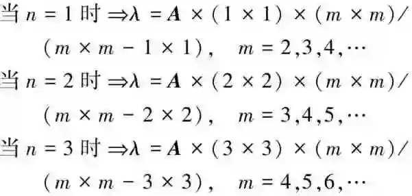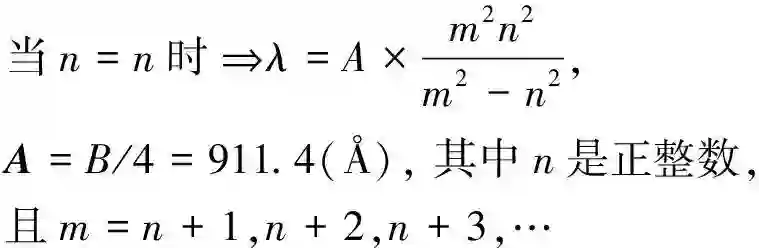 从几何图形上看到各个谱线就像透视图那样,由近而远,逐渐缩小,就能领悟到谱线波长有迫近某一极值的趋势。以形求数,便成了分析对策,如再细心观察巴耳末公式的数学形式,是不是很像下列式子: