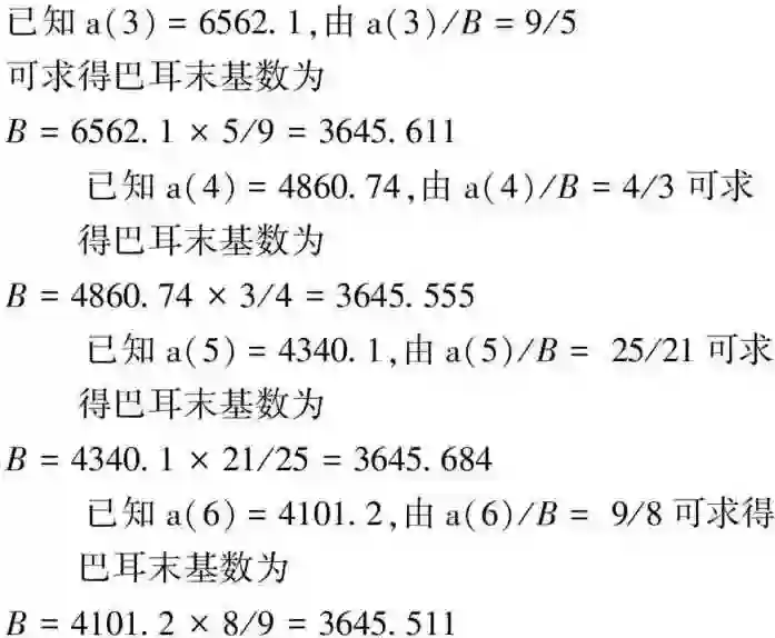 由于每个分数都是近似值,取平均值得B=3645.59,如与巴耳末一样取小数后一位的话,那就得到一样的数值:3645.6,终于这般如此容易,巴耳末基数现身了。