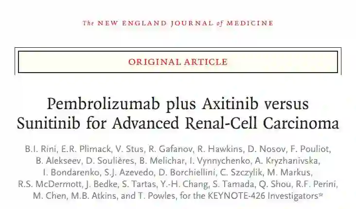 与舒尼替尼相比,帕博利珠单抗联合阿昔替尼显著改善了先前未经治疗的晚期或转移性肾透明细胞癌患者的总生存、无进展生存和客观缓解率,同时具有可控的安全性。这些数据表明,帕博利珠单抗联合阿昔替尼应成为转移性肾透明细胞患者新的标准治疗方案。