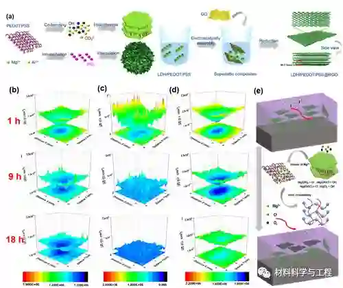 图2 (a)石墨烯绝缘封装材料制备示意图;(b,c,d)不同涂层缺陷处的局部交流阻抗分布与(e) 修复机理