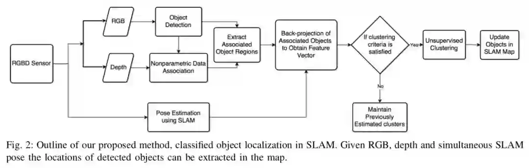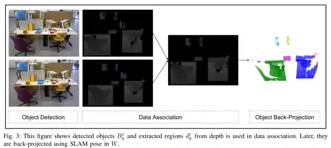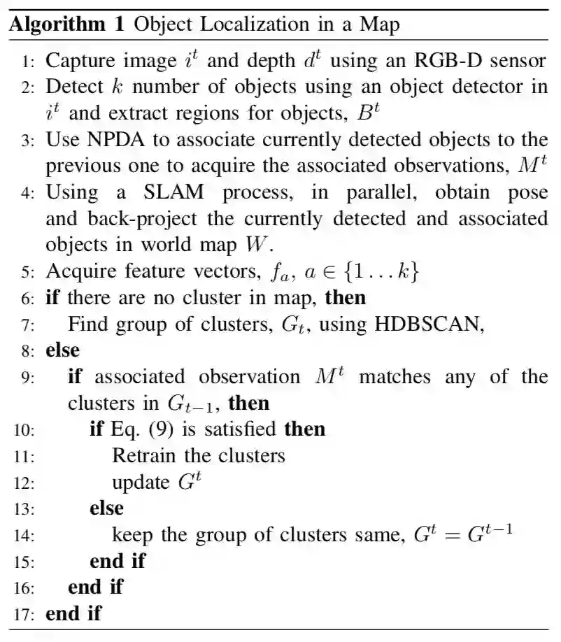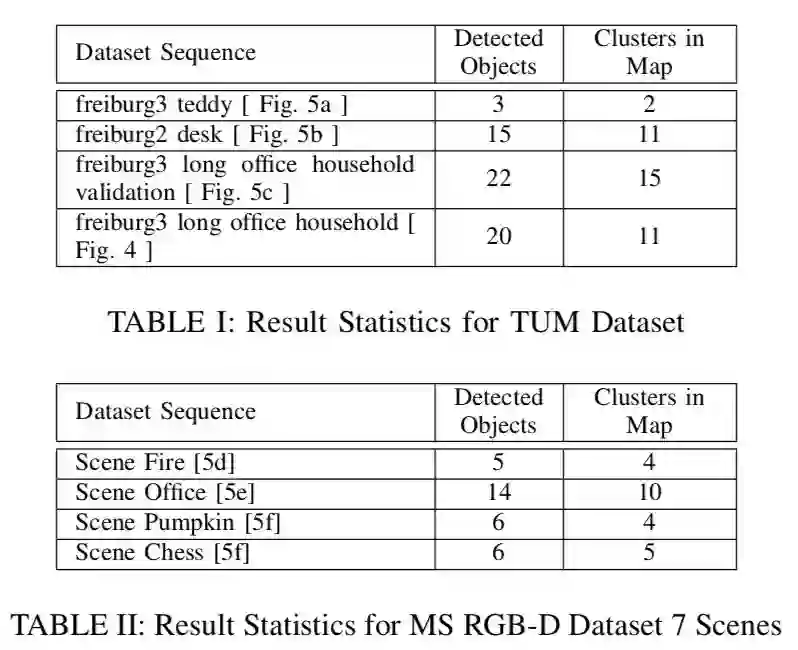 在这过程中,一个主要的困难在于对一段时间内检测到的物体的数据关联。作者展示了一种无参数的统计方法来解决连续帧中被检测到的物体的数据关联问题。随后作者使用了一种无监督聚类方法来识别物体是否存在于地图之中。整个这个线程可以与SLAM平行运行。