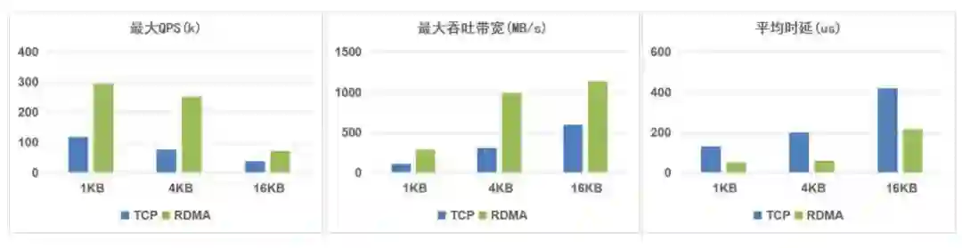 从上面的测试结果看到,在包含有实际业务的测试中,RDMA的表现并没有原始的RDMA测试表现那么优异,我们分析了其主要原因是线程切换、数据复制等操作以及IO路径上其它模块引入了额外的开销。
