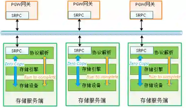 前端PGW请求发送和回调、存储服务端请求处理采用run to complete的方式在同一线程完成,极大地提高单个请求的处理速度,并采用无锁化编程的方式启用多个线程分组处理请求,达到请求的高并发。此外设计了统一的数据缓存管理机制,整个请求处理过程从数据经RDMA接收后,经过各模块处理,再到通过RDMA发送出去,全程不需要对数据进行内存拷贝,进一步减少系统开销并大幅降低了延迟。