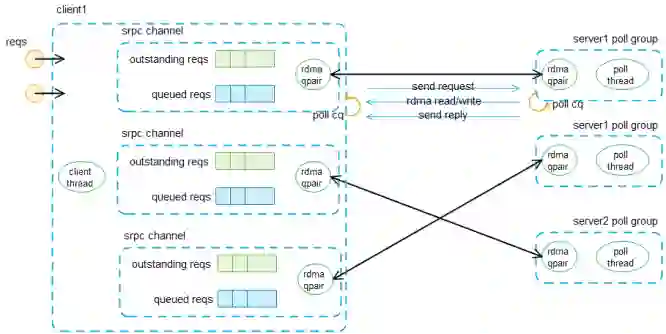 由于RDMA的异步编程模型,需要进行Polling来检测数据操作的完成,使用单独的线程轮询不但没有降低CPU,反而有更多的CPU开销,而如果使用事件机制则会增加延迟降低性能。