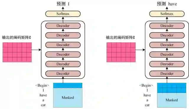 将第一步得到的向量矩阵传入编码器,编码器包含 6 个 block ,输出编码后的信息矩阵 C。每一个编码器输出的 block 维度与输入完全一致。