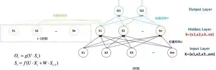 从上图可以看出,Sn 时刻的值和上一时刻 Sn-1 时刻的值相关。将 RNN 以时间序列展开,可得到下图:
