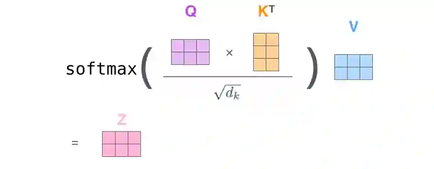 如果将输入的所有向量合并为矩阵形式,则所有 query, key, value 向量也可以合并为矩阵形式表示。以上是一个单词一个单词的输出,如果写成矩阵形式就是 Q*K,经过矩阵归一化直接得到权值。