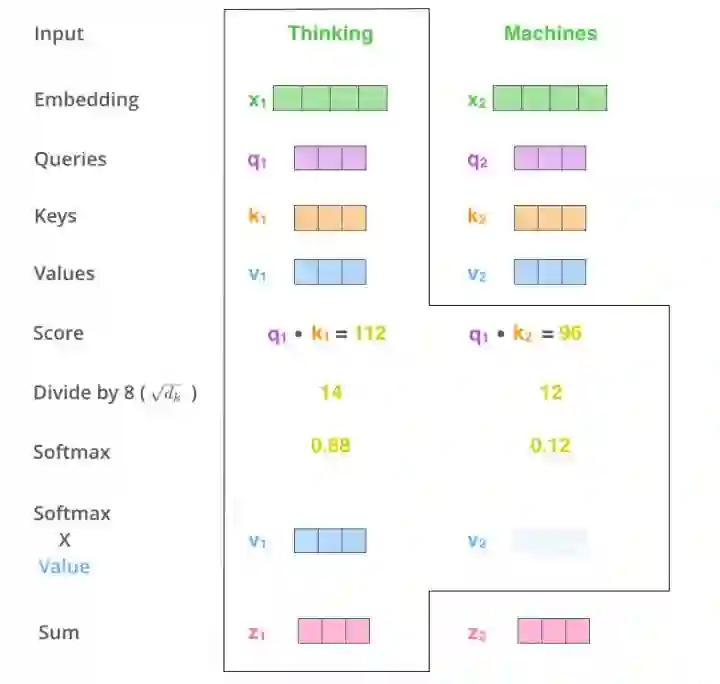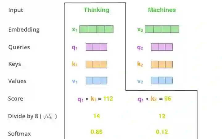 当处理 Thinking 这个词时,需要计算它与所有词的 attention Score,将当前词作为 query,去和句子中所有词的 key 匹配,得出相关度。用 q1 代表 Thinking 对应的 query vector,k1 及 k2 分别代表 Thinking 和 Machines 的 key vector。在计算 Thinking 的 attention score 时,需要先计算 q1 与 k1 及 k2 的点乘,同理在计算 Machines 的 attention score 时也需要计算 q_2 与 k1 及 k2 的点乘。如上图得到了 q1 与 k1 及 k2 的点乘,然后进行尺度缩放与 softmax 归一化,得到: