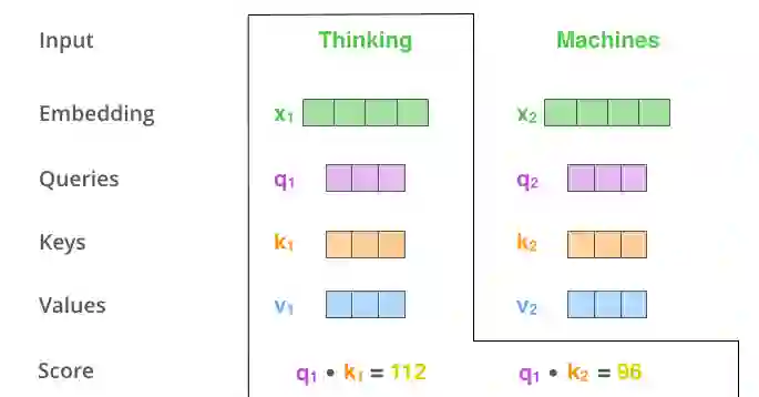 显然,当前单词与其自身的 attention score 最大,其他单词根据与当前单词的重要程度得到相应的 score。然后再将这些 attention score 与 value vector 相乘,得到加权的向量。