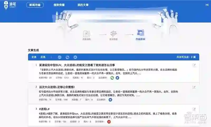 妙笔机器人的改稿过程主要分为三步:第一步,输入原新闻稿标题和内容;第二步,机器对原文进行理解和分析;第三步,选择成稿数量,针对微信、微博和网易新闻的特性,在保证中心内容不变的情况下,改换不同风格的标题和内容,自动插入相关图片、商品链接、名词解释和延伸阅读。