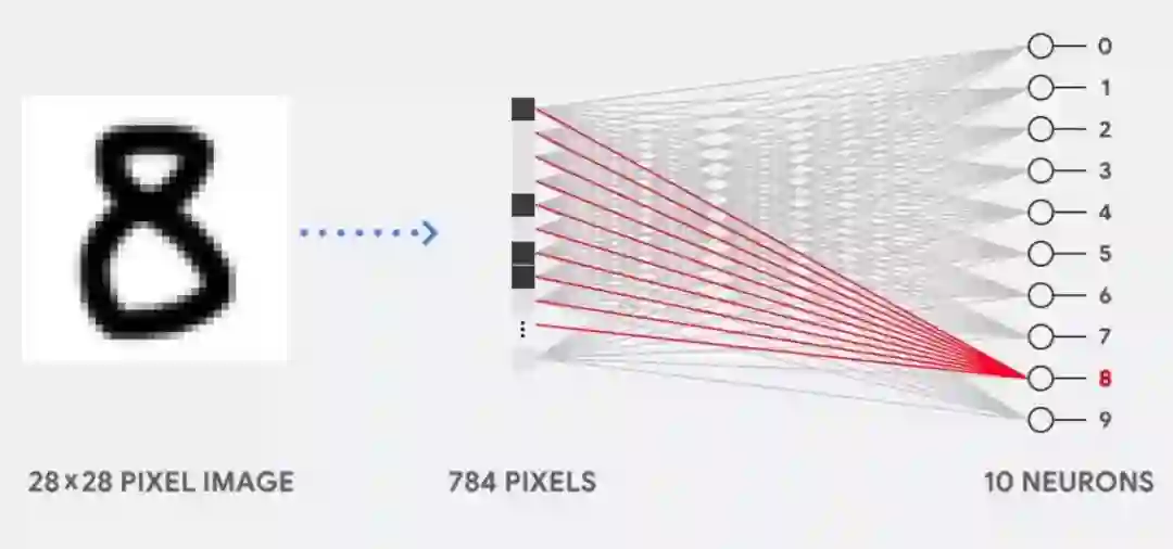 如果图像为 28×28 像素的灰度图,那么它可以转化为包含 784 个元素的向量。神经元会接收所有 784 个值,并将它们与参数值(上图红线)相乘,因此才能识别为「8」。其中参数值的作用类似于用「滤波器」从数据中抽取特征,因而能计算输入图像与「8」之间的相似性: