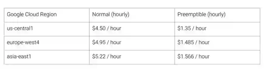 因此使用 TPU 架构的好处就是:降低成本。以下是截至 2018 年 8 月(写这篇文章的时候)Cloud TPU v2 的使用价格。