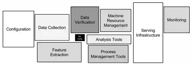 现实中的机器学习系统仅有一小部分是由机器学习代码组成的,就像上图中间的这个小块所显示的一样。来源:Hidden Technical Debt in Machine Learning Systems