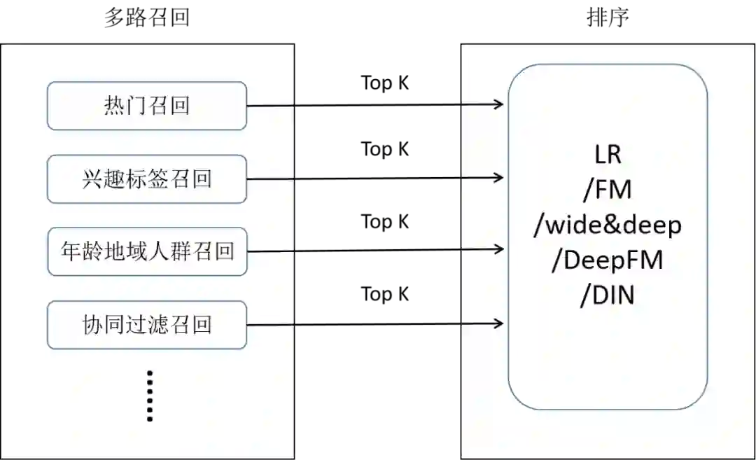 一般经典的召回方法即采用多路召回的方式,如下图所示。
