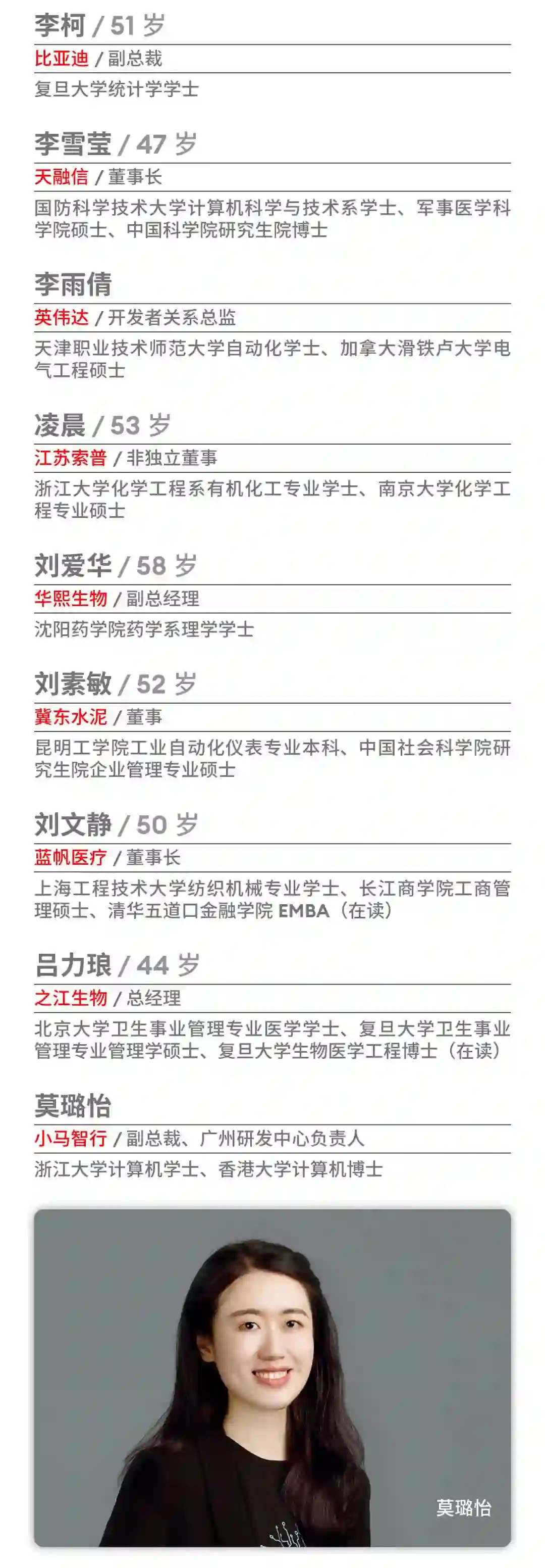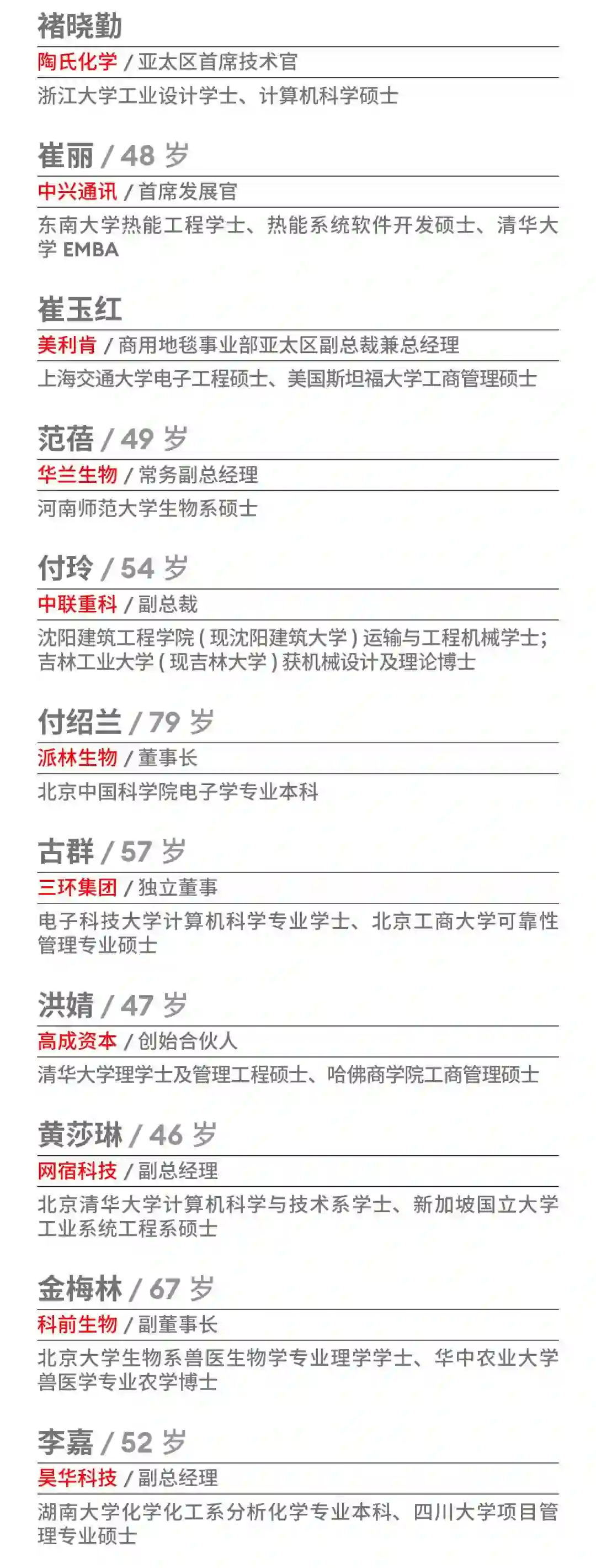 今年,仍有50名中国顶尖科技女性登上该榜单,她们不仅具有强大的企业家精神和深厚的科技背景,还善于运用女性独特的细腻和坚韧,给科技界带来了别样的风景和创新视角。