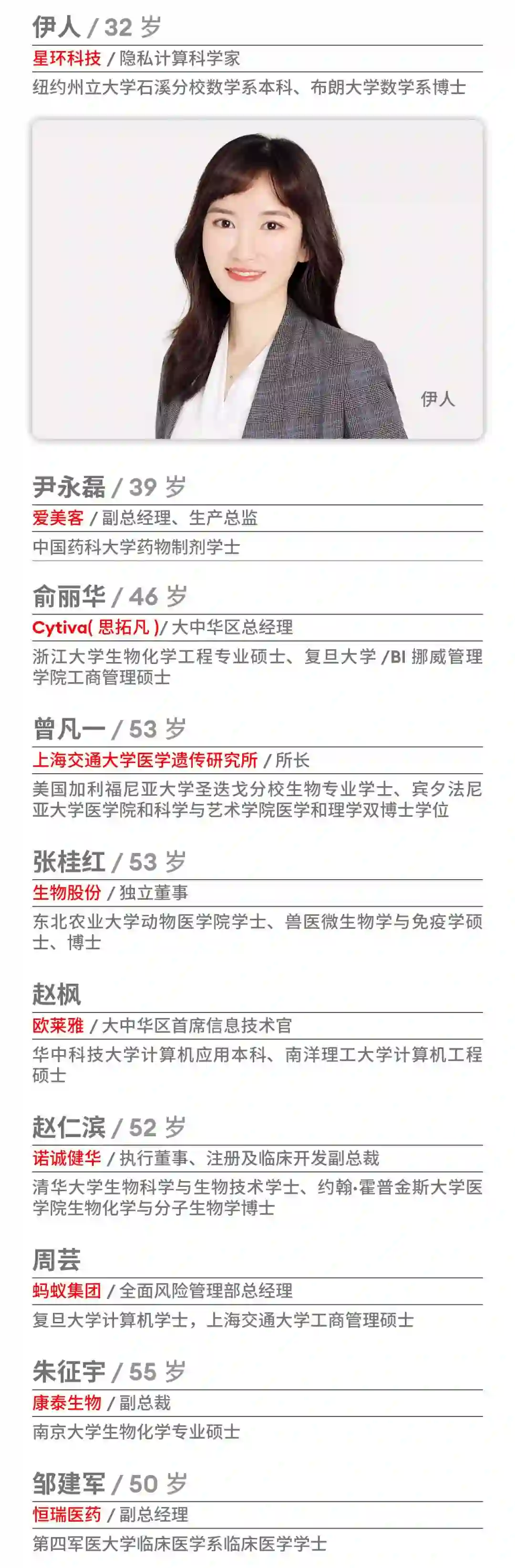 数据显示,此次上榜的科技女性平均年龄为38.38岁,年龄最大的是79岁,年龄最小的是32岁;教育背景方面,学士学位占比26%,硕士学位为40%,博士学位为34%,海外求学经历比例达24%;行业方面,医药行业和科技行业最多,占比超过60%;公司方面,国内企业占80%,其中20%为创业公司,而外企为20%,74%为上市公司。