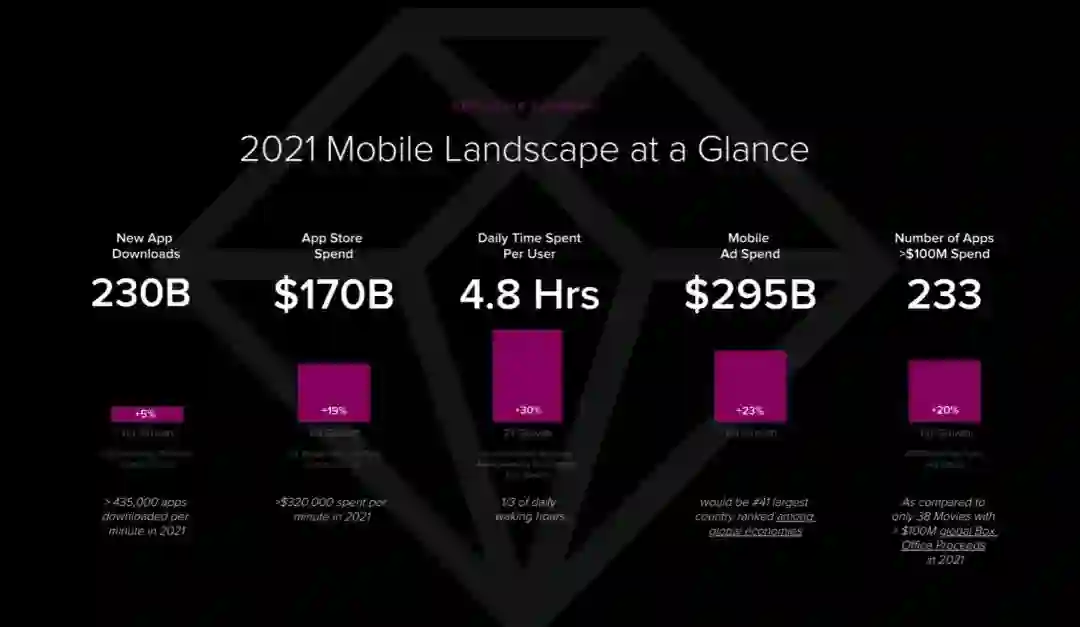 根据移动分析公司 App Annie 的数据,在前 10 个市场,2021 年每天花在移动设备上的平均时间为 4.8 小时,比 2019 年增加了 30%。App Annie首席执行官Theodore Krantz称智能手机、平板电脑和其他手持设备是“未来的首选设备”。例如,2021年美国人平均每天花4.1小时在移动设备上,但只看了3.1小时的电视。