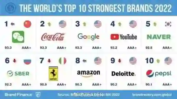 知名品牌估值和战略咨询公司 Brand Finance 发布《2022年全球品牌价值500强》,其中,腾讯的微信连续第二年蝉联全球最强品牌。根据这份报告可以发现,微信蝉联全球最强品牌称号,品牌强度指数得分为 93.3/100,AAA+ 评级,成功夺得了本次的桂冠位置。