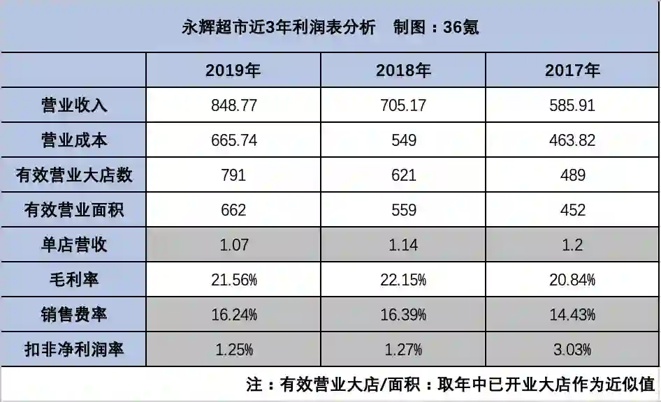 最近3年,永辉单店营收和毛利率都出现不同程度的下滑。永辉财报显示,近两年的扣非净利润率从2017年的3%下降到了1.2%,这个降幅是惊人的,假如规模不变,意味着净利润比腰斩还多。