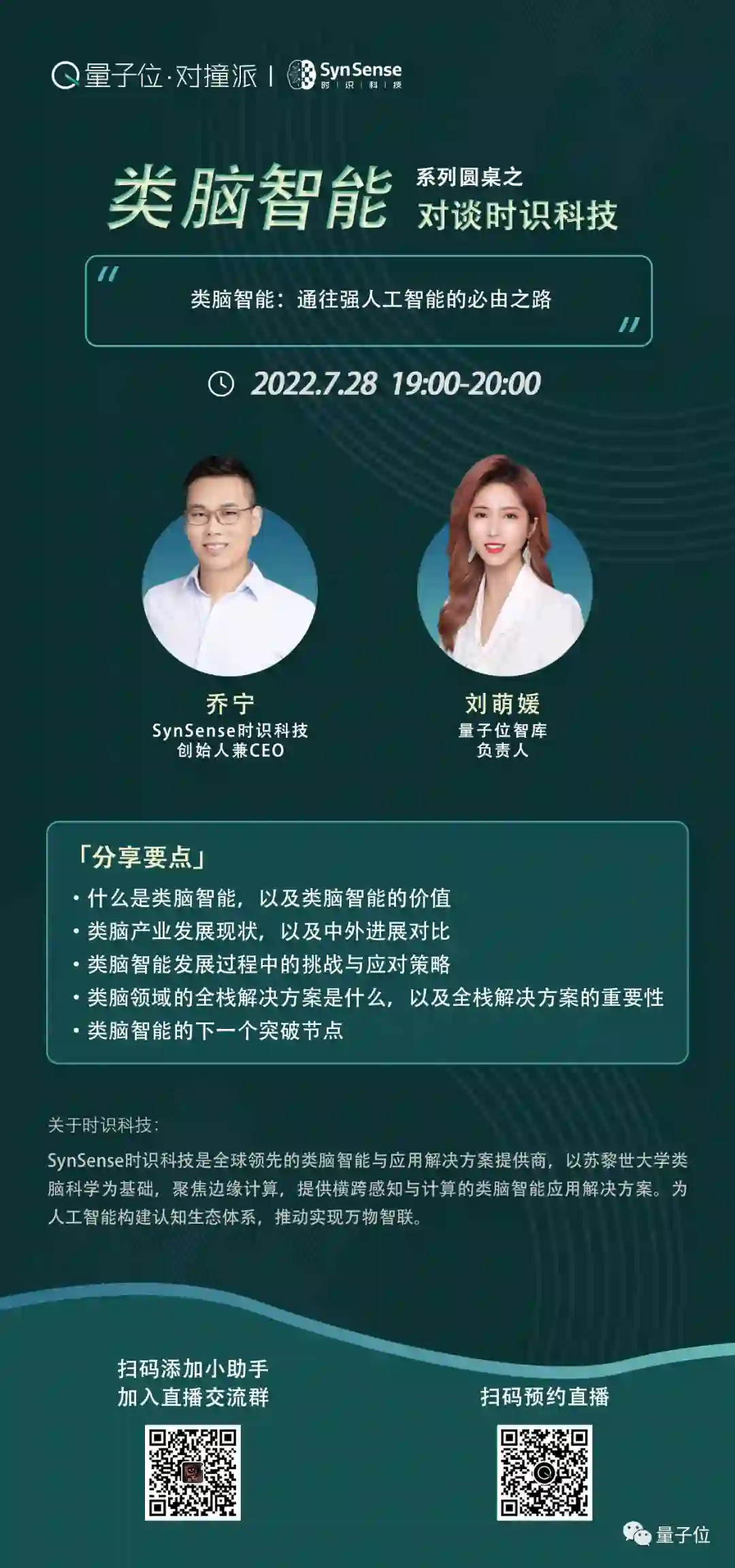 7月28日晚19:00,“类脑智能”系列对谈节目第一期「量子位·对撞派」邀请到了全球领先的类脑智能企业——时识科技,将由时识科技的创始人兼CEO乔宁博士为我们分享~