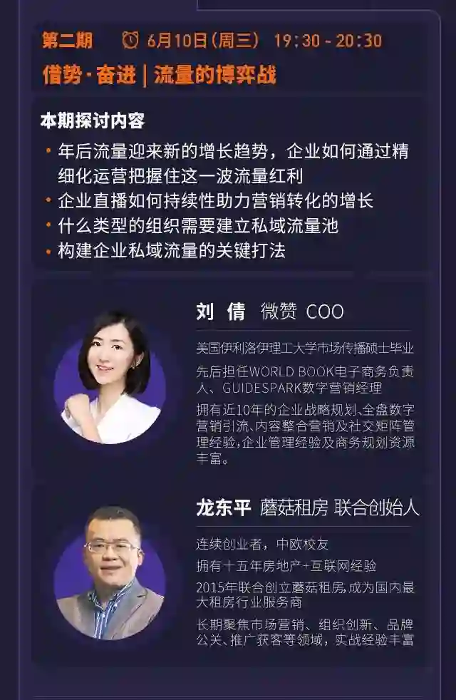 2020年因一场疫情,商业大环境的势能下降,整个互联网也随着大趋势进入缓慢的复苏期,创业邦旗下企业会员产品--优企酷特别策划了“VALUE TALK势能直播”活动,针对热门行业、业务及新产品就应对经济恢复期面临的多重挑战,进行专业拆解、思考、对话,共同碰撞“品牌营销、业绩增长、管理效率”的价值思维火花。新一期的优企酷势能直播,联合入驻企业微赞将推出新的干货分享,邀请到微赞COO刘倩女士和蘑菇租房联合创始人龙东平先生,就疫后流量的博弈进行解读。