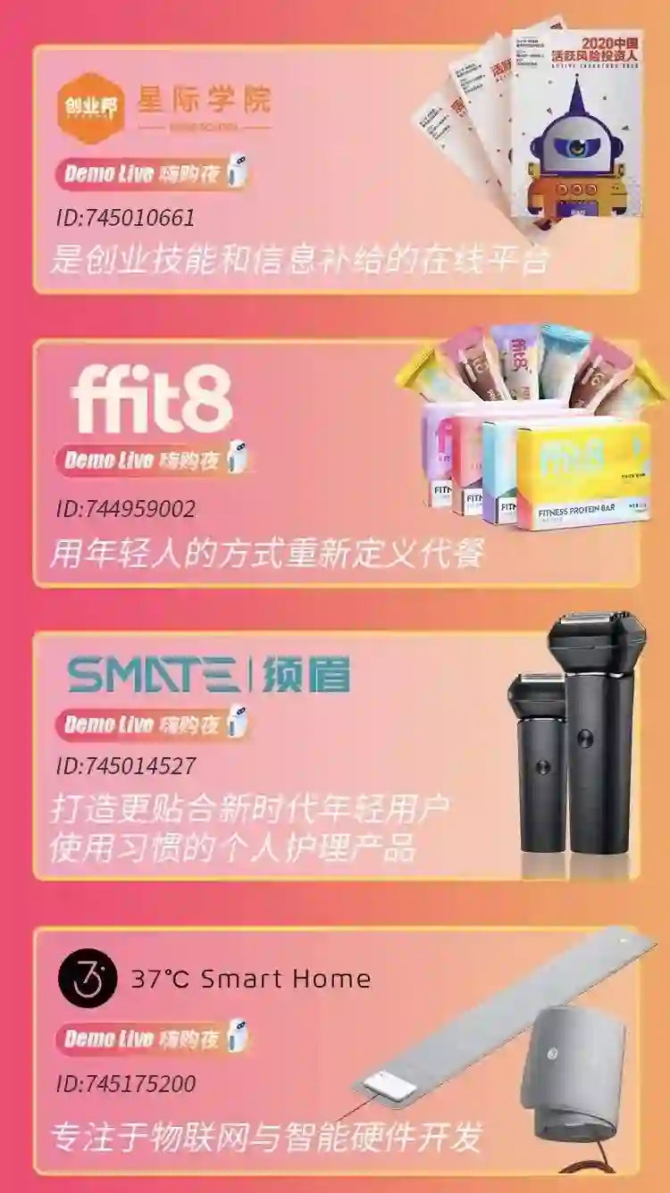 点击文末DEMO CHINA峰会页面链接里的“LIVE嗨购夜”以及创业邦官网相关专题页面均可直达观看