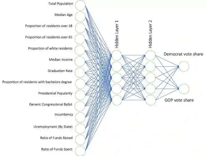 最终的神经网络模版,拥有14个输入节点,两组隐藏层,每组隐藏层有5个神经元,每个单一输出结点,给出预期的共和党和民主党的投票占有率。