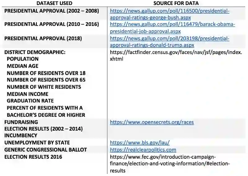 表一中的数据集,是从广大的对大选结果有影响的因素中,选出的具有代表性的一些数据集。来自人口普查局的数据是手动归档的。2002-2014年的竞选经费,选举结果和任期数据,都是通过python网络爬虫程序在2018年9月爬到的,爬虫程序中使用了Beautiful Soup包。这些数据存储在一个Excel电子表格中(见附录)。