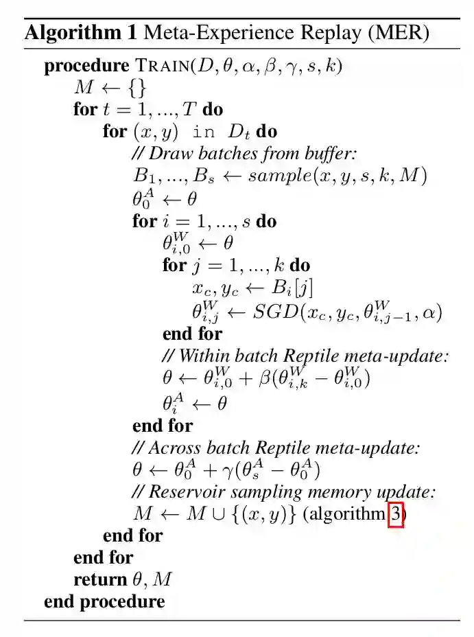 MER maintains an experience replay style memory M with reservoir sampling and at each time step draws s batches including k − 1 random samples from the buffer to be trained alongside the current example. Each of the k examples within each batch is treated as its own Reptile batch of size 1 with an inner loop Reptile meta-update after that batch is processed. We then apply the Reptile meta-update again in an outer loop across the s batches.