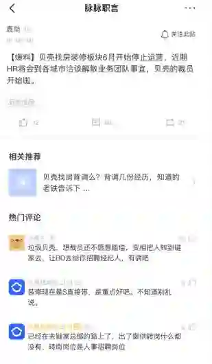 6月1日,脉脉网友在平台发言表示,贝壳找房装修板块6月开始停止运营,近期HR将会到各城市洽谈解散业务团队事宜。