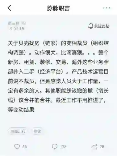 今年2月,脉脉网友在平台发消息称,“关于贝壳找房(链家)的变相裁员(组织结构调整)。动作很大,比滴滴狠...整个新房、租赁、装修、交易、海外这些业务全部并入二手(经济平台)。产品技术运营目前说不裁员,但是感觉人员大于工作量,一定有多余的人。其他职能线该撤的撤,(增长线)该合并的合并。最近工作不用推进了,等变动结果”。