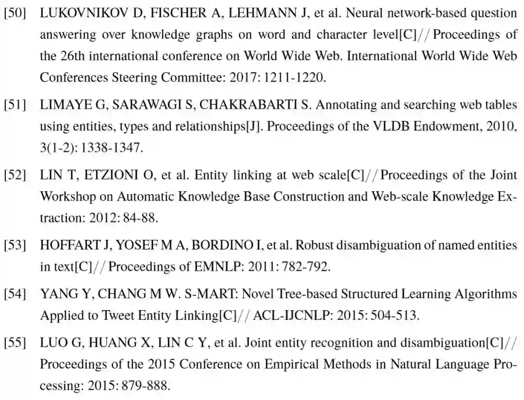 作为自然语言理解中的基本任务,实体链接是一系列下游任务的前置步骤。首先,开放式信息抽取抽取的主谓宾三元组均为文本表示,通常具有歧义,一些研究工作旨在对三元组中的实体短语进行链接,代表文献包括[4,52],在实现三元组消歧的同时,结合知识库推理出主语和宾语所代表的类型,有助于挖掘不同谓词关系之间的语义联系。 其次,实体链接与知识库补全任务密切相关,该任务的目的是向已有知识库中补充新的事实三元组。这些新添加的三元组主要来源于两方面:随时间发展所产生的全新事实, 或基于已有知识的归纳推理。基于前者的补全依赖于信息抽取系统的不断挖掘,因此对主宾语的链接的准确率决定了知识库补全的效果。知识库补全的相关内容将在2.2节中论述。最后,对于自动问答任务,尤其是我们关注的基于知识库的事实类自动问答任务, 其描述的是与问句中实体相关的事实,因此不管以何种方式对答案进行建模,都依赖于对已有实体的准确定位,以限定问句对应语义的搜索范围。因此,实体链接的结果好坏,对这些任务的效果均有着很大程度的影响。