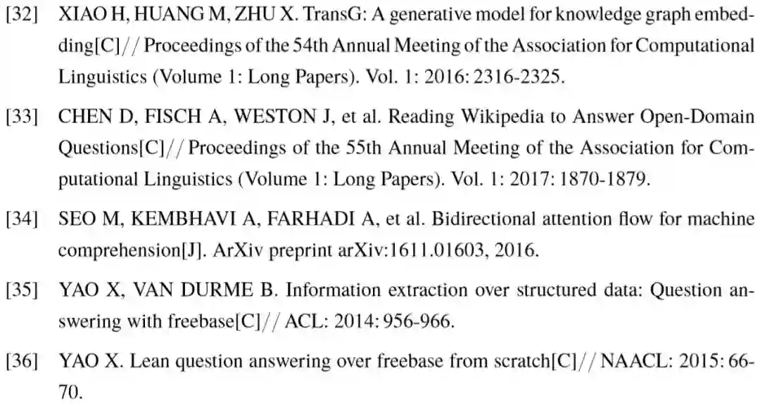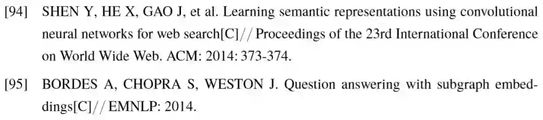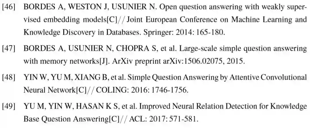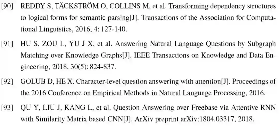 对于知识库问答任务,使用的外部信息显然为结构化知识库。正确答案的获取依赖于问答模型对问句整体语义的理解:一方面准确定位问句中出现的相关实体,并链接至知识库;另一方面根据问句信息,推理出未知答案与相关实体在知识库中具有的关系。前者涉及到实体链接技术,后者体现了问句与知识库的语义匹配,也是问答模型的核心。为了衡量问答模型对不同类型问题的效果,学术界已提出了大量知识库问答数据集,例如对问句进行结构化语义标注的 QALD [86] 和 Free917 [38],以及具有更大规模问答数据量的 WebQuestions [40] 和 SimpleQuestions [47] 等。