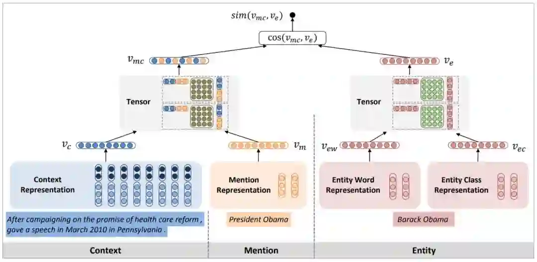 Sun 等人[18] 的模型对不同的上下文信息采用了不一样的网络结构。如图2–3所示, 对短语建模的信息包括短语自身,以及去除自身后的句子两部分,而实体方面,除了利用本身名称之外,还使用了它在维基百科中的分类信息,用这类人工提炼的知识补充实体的表示。对句子的表示学习依然使用卷积神经网络,其余三种信息由于长度较短,均直接使用了词向量平均的方式得到向量表达。进一步,该模型利用较为复杂的神经张量层将各部分向量结合,分别得到实体和短语的整体表达。类似的方法还有文献[19],对实体的维基分类信息进行表示学习,通过双向循环神经网络对短语所在句子进行编码。 同时模型定义了不同信息之间的多种损失函数,对训练数据的利用更加充分。