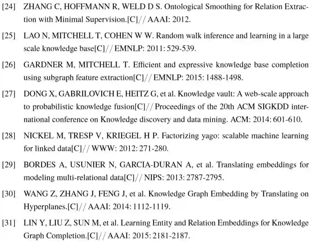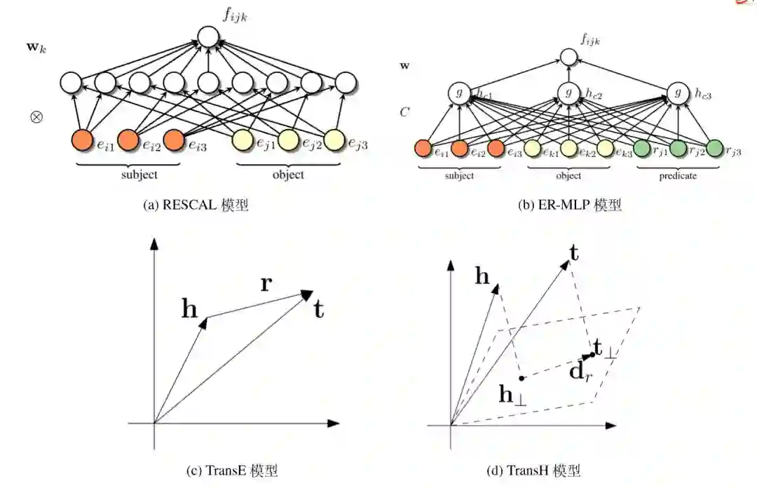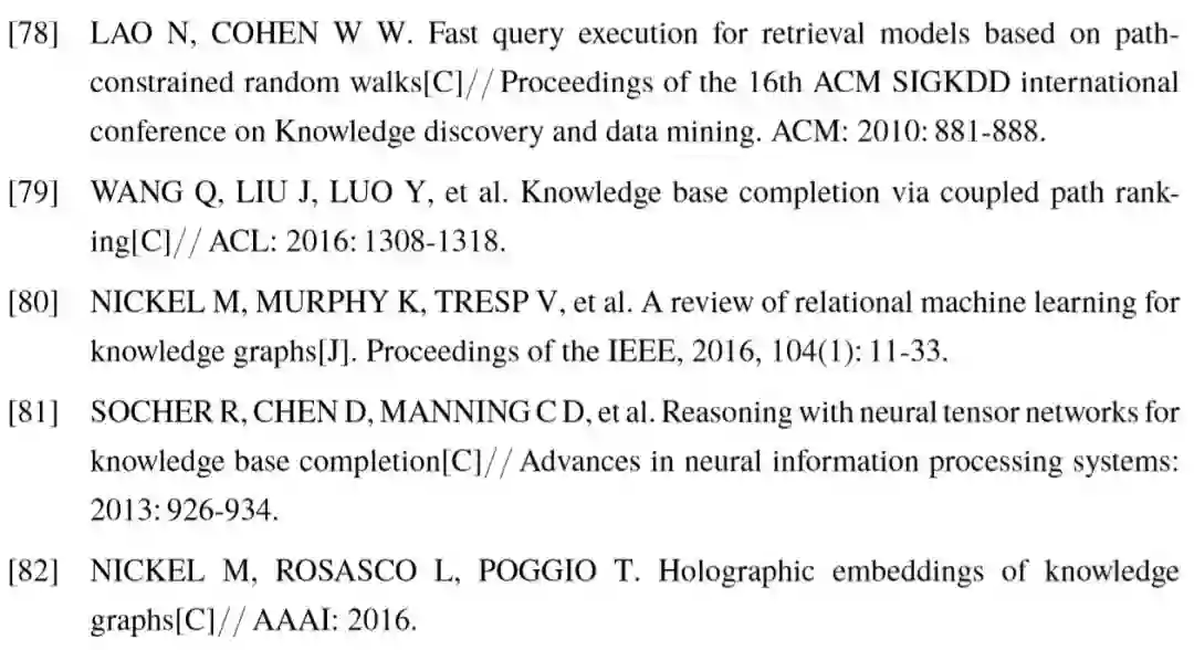 此外,还有其它 TransE 模型的改进工作,包括体现距离度量在不同特征维度间差异的TransA [85],生成谓词多个表示以解决一对多问题的TransG [32] 等,这里不再展开讨论。