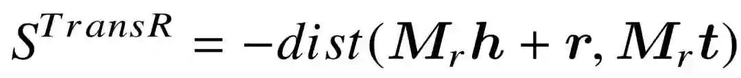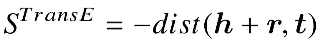 另一类知识库向量模型是以 TransE 为典型的被称作隐距离模型。相比 RESCAL 等模型依照神经网络构建的置信分函数,隐距离模型对置信分的计算则与距离度量直接相关。这与 2.1.3 节介绍的跨语言词向量训练有着相似之处,源语言词向量经过转换后,与翻译后的词向量尽可能相近。而对于知识库向量模型,由于三元组中还有谓词的存在, 因此模型训练的实质,是学习主宾语实体向量在特定谓词下的变换方式,对变换之后的向量表示进行距离度量,距离越近,则置信分越高。为了和相关工作统一,此处用( ,