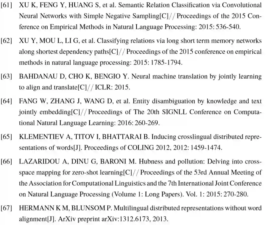 对于 的定义,相关文献进行了不同的尝试。Mikolov 等人[60] 发现,在不同语言中,多个单词的向量表达之间,几何关系较为相似,例如英语和西班牙语中,表示数字的单词之间的相对位置几乎一致,表示动物的单词也有类似特性。基于以上观察,该工作提出的模型使用了线性变换的方案,训练转移矩阵