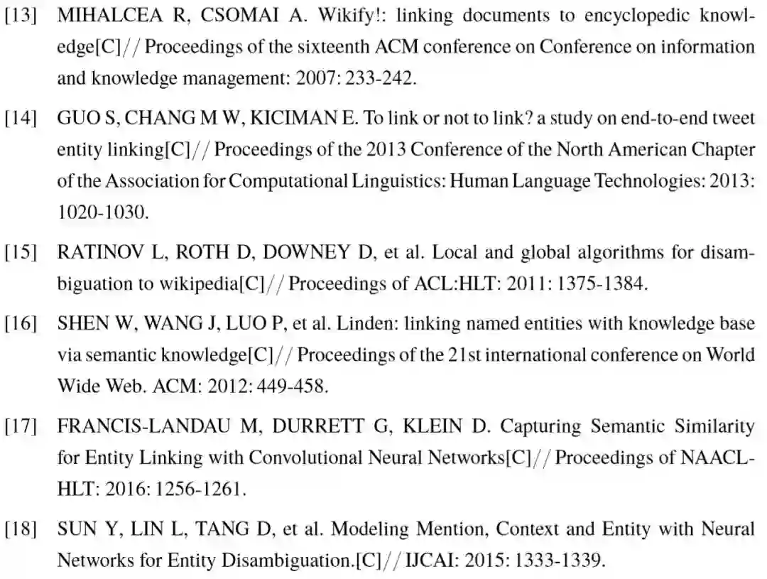 在这类方法中,一个候选实体所具有的特征可以分为三类:先验特征,上下文语义特征,以及与句中其它实体的关联特征。先验特征与短语所处的文本无关,仅基于短语与候选实体在维基百科中的统计信息,主要体现为短语所在锚文本链接至该实体的概率,以及实体出现在不同维基页面中的概率。上下文语义特征关注文本及目标实体的语义近似程度,利用词袋模型( Bag-of-Words )将短语的上下文以及目标实体的维基页面分别转化为向量形式,通过 TF-IDF 得到不同词语的重要性,并用向量间的相似度代表语义匹配程度。实体间的关联特征体现在不同短语所对应的实体之间,它们维基百科页面的相关性有助于实体链接的判断。在维基百科中,若两个实体同时指向的页面较多, 或同时指向这两个实体页面的其它实体较多,则它们具有较高的相关度。常用的计算方式主要为点对点互信息( PMI )[15] 或基于谷歌距离的维基链接度量( WLM )[16]。其它的可选方式包括 Jaccard 相似度,以及具有非对称形式的条件概率。