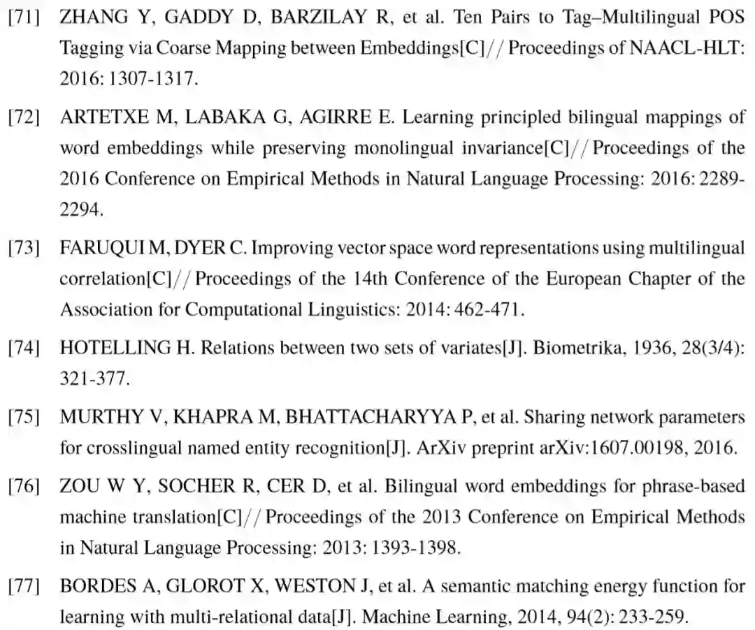 基于线性映射的跨语言词向量模型具有一些变种,例如文献 [70, 71] 限制转移矩阵 为单位正交阵,以保证映射后的词向量维持单位长度,Artetxe 等人[72] 指出,对于模型效果而言,转移矩阵正交化比向量正则化更加重要。Lazaridou 等人[66] 对