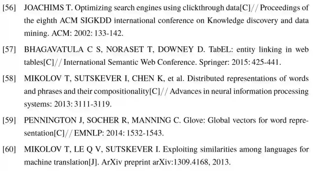 对于实体链接模型的训练方式,若不同的实体短语之间互相独立,那么训练过程是一个简单的监督学习问题,即判断每一个<短语,实体>对的正确性。考虑到每个短语仅对应唯一的正样本,其余所有候选实体均为负样本,为了保持正负样本的平衡,一般采用 Ranking SVM [56] 或最大间隔( Max Margin )模型进行训练。这样的做法称为局部优化,显然忽略了候选实体之间的关联。为了能捕捉这一特征,Ratinov 等人[15] 首先利用 局部优化方案,对每个实体短语进行链接,得到具有一定质量的次优解,然后根据次优解计算候选实体与其它实体的关联特征,用于完整的模型训练。Shen 等人[16] 对两个实体之间的相关度计算进行了类似的简化,将单个实体与其余短语的所有候选分别进行相关度计算,并选取最大值作为特征。Bhagavatula 等人[57] 通过迭代的方式不断对每个短语预测的实体进行更改,实体间的相关度特征也随着不断变化,更加靠近真实情况。以 上这些方法通过简化特征或迭代预测的方式,使得训练过程得以保持对每一个 < 短语, 实体>进行打分的形式。