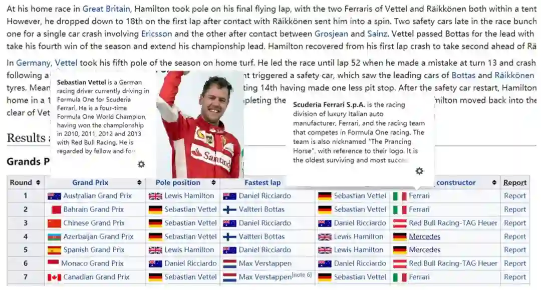 首先,实体层面的语义理解体现为实体链接任务,即从自然语言文本中寻找出代表实体的短语,并匹配到知识库中的特定实体。如同维基百科编辑者在页面中会添加一些超链接文本,并指向其它实体页面,使得读者可以快速了解与当前页面相关的实体信息,自动化的实体链接可以应用于开放领域的自然语言文本,从而实现消歧义的目标。文本输入可以是非结构化的文本,也可以是半结构化形式,例如互联网中存在的表格。 图1–2展示了维基百科中关于赛车的一个页面,其中纯文本和表格中的内容均被添加了超链接,指向了特定的车手、车队等实体页面。