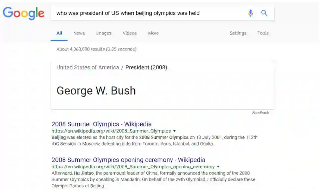 最后,对于句子的语义理解,为了能充分利用知识库的信息,我们关注描述客观事实的问句,通过自动问答任务衡量其语义理解能力。自动问答具有广泛的应用场景,搜索引擎便是其中之一。传统的搜索引擎工作方式依靠信息抽取相关算法,比较用户查询与网页的相似度,主要利用词级别的共现模型,如 TF-IDF [10],或词级别的语义匹配模型,如 LSI [11],pLSA [12] 等。但对于用户输入的复杂问题,词级别的匹配难以直接定位到用户想要的答案或网页。更加智能化的搜索引擎,则尝试对问题进行推理,并根据已有的知识库,将答案定位至已知的实体中。Google 建立了以 Freebase 为基础的知识库(Google Knowledge Graph),当用户搜索一些名词时,如图1–3中,用户搜索“george w bush” ,结果页面右侧会显示实体的信息框,包括其属性,以及与其关联的其它实体 等。而如图1–4所示,当用户输入较为复杂的问题 “ who was president of US when beijing olympics was held ”,搜索引擎能在结果页面上方显示出自动回答的结果。对比下方的传统页面搜索结果可见,精确返回答案能大大提升查询过程的用户体验。