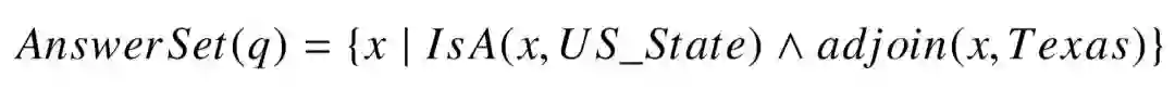 解释语义解析技术之前,我们先讨论人类对问题的思考方式。对于人类来说,问句 “what state borders texas” 包含了两个与正确答案相关的线索:1) 答案是一个(美国的)州;2)答案与德克萨斯州相邻接。由于答案未知,因此每一个线索都对应着一个具有变量参数的事实三元组。语义解析技术的目的,就是用存在于知识库上的实体和谓词,对这些线索进行结构化表示。根据这两条线索,原问题的答案集合可表示为一阶逻辑表达式: