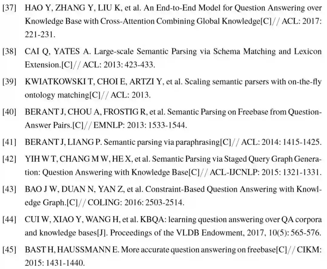 由此可见,基于语义解析的自动问答模型,实质是寻找正确的语义结构化表示,即判断<问题,结构化语义>的匹配程度,而不仅仅寻找一个答案实体。相关工作[39,40, 42,43]的研究重点在于,如何由句子生成知识库上的结构化语义表示,以及如何对问题和语义结构的匹配程度进行建模。