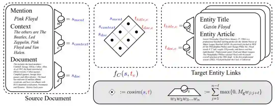 实体链接的重点在于从多个候选中找出正确的那个实体,其本质为消除实体级别存在的一词多义性,例如短语 “ Michael Jordan ” 具有多个可能的候选,在维基百科中可能代表篮球明星、足球运动员、著名的机器学习教授,甚至更多不那么有名的人。在缺乏上下文信息的情况下,很难进行准确的链接。因此,一个良好的实体链接模型,相关性分数需要考虑多个因素,包括实体本身的先验知识,实体与短语的匹配程度,以及实体与短语所在上下文的契合度。