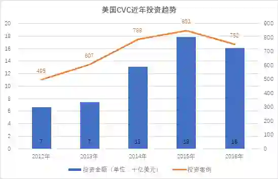 美国的CVC投资在2012年就已发展成熟,投资案例495起,投资金额70亿美金。2014年后,CVC投资的数量与金额增幅较小。2016年面临全球资本寒冬,相比2015年投资案例数与金额都有所减少,其中投资案例数减少12%,投资金额减少11%,但项目平均投资基本持平,约为2100万美元。