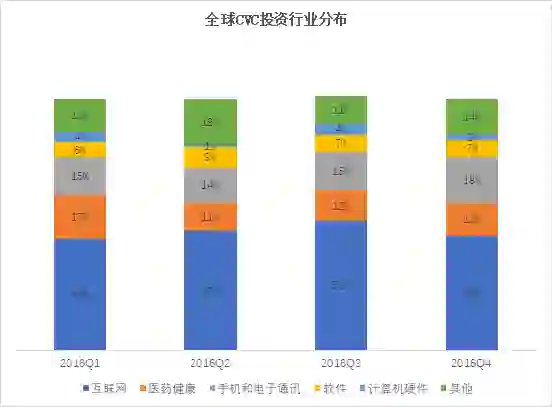 在2016年第三季度,互联网行业占据了CVC交易的51%。在2016年第四季度,互联网和手机行业共占据了交易份额的63%,其中手机行业增加到交易份额的18%。这与传统风险投资近年来投资的行业分布相差不大。